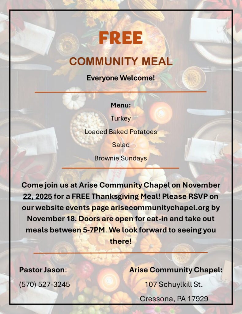Everyone welcome! Come join us for a FREE Thanksgiving Meal! Doors are open for eat-in and take-out meals between 5-7PM. We look forward to seeing you there!